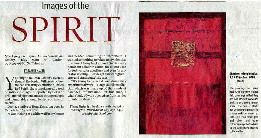 Elaine Hujer. “Images of the Spirit.” Hamilton Spectator. Aug. 26, 2005: Go13