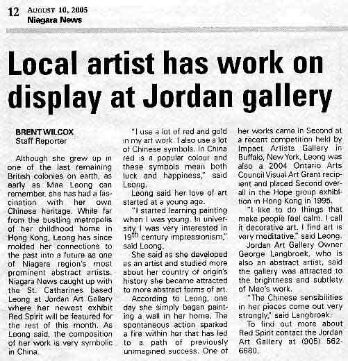Suzie Chiodo. “Artist inspired by Chinese background.” The Grimsby Lincoln News, July 27, 2005: 21 K. o’day. “Red Spirit.” Art Voice (Buffalo, NY) January 5, 2006: 24