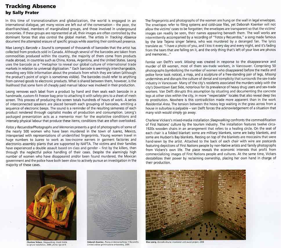 Sally Frater. “Tracking Absence.” Exhibition Essay. A Space Gallery (Toronto). Nov. 2006
